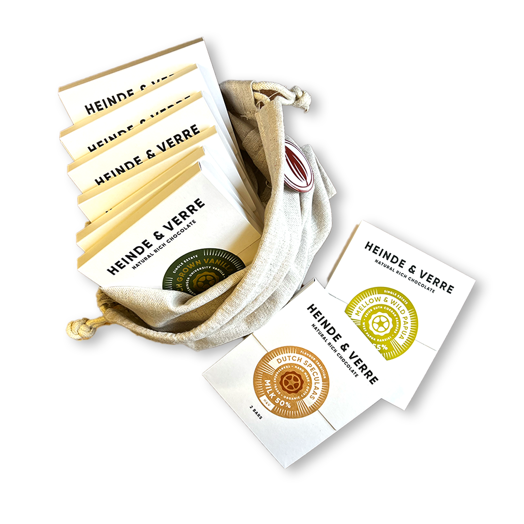Kdo by nemiloval tuto holandskou čokoládovnu. My se jejich tabulek nemůžeme nabažit, ať už kvůli jejich krásným obalům, tak hlavně kvůli chutím. Všechny tabulky v balení jsou z výběrových kakaových bobů z těch nejlepších plantáží a zajímavých příchutí. Užijte si svou domácí degustaci s Heinde&Verre. Balení v dárkovém látkovém sáčku je zahrnuto v ceně produktu.